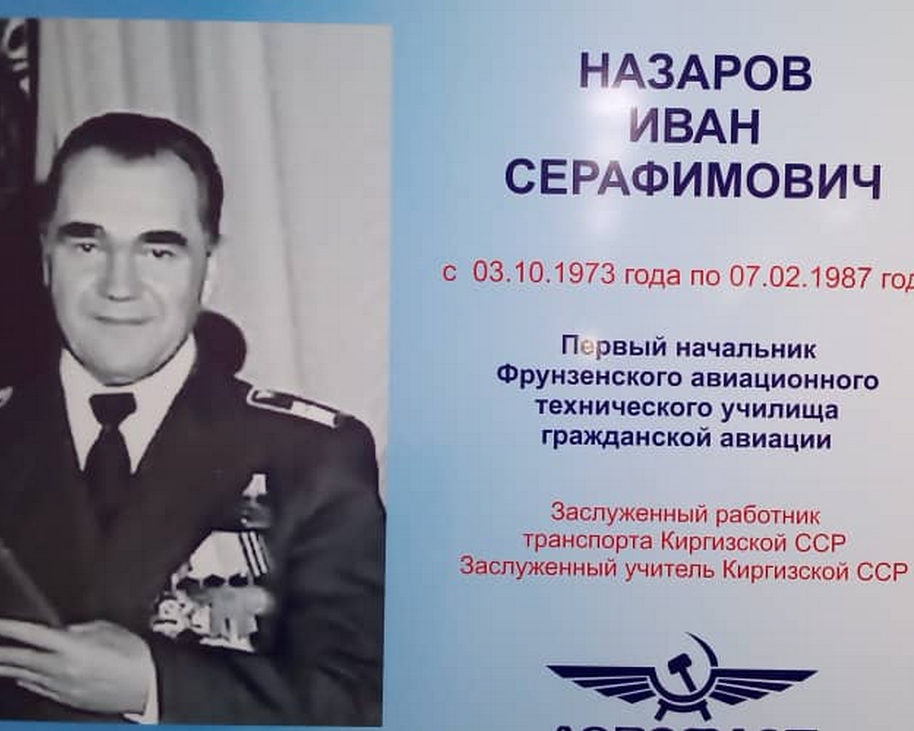 19 сентября 2019 года в Кыргызском авиационном институте им. И. Абдраимова прошла презентация нового конференц-зала им. Назарова Иван Серафимовича - первого начальника ФАТУ ГА. На презентацию были приглашены руководители авиапредприятий и ветераны ГА КР: Бусурманкулов А.Б. - заместитель генерального директора ОАО МАМ, Калмурзаев К.К. -председатель РК Профсоюза авиаработников КР, Козубеков К.К.- Почетный авиатор КР, Камбаров Э.Н. – председатель Президиума общественнного объединения ветеранов ГА КР, соратник И.С. Назарова, Умарова Т.Ш. -ветеран ГА КР.