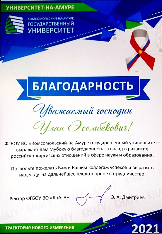 Директору Кыргызского авиационного института им. И.Абдраимова Улану Эсембековичу Курманову от имени ректора Федерального государственного бюджетного образовательного учреждения высшего образования Комсомольский-на-Амуре государственного университета Эдуарда Анатольевича Дмитриева вручили письмо с выражением благодарности за вклад в развитие российско-киргизских отношений в сфере науки и образования.