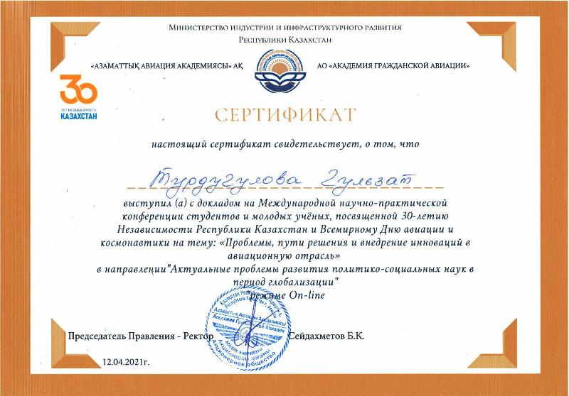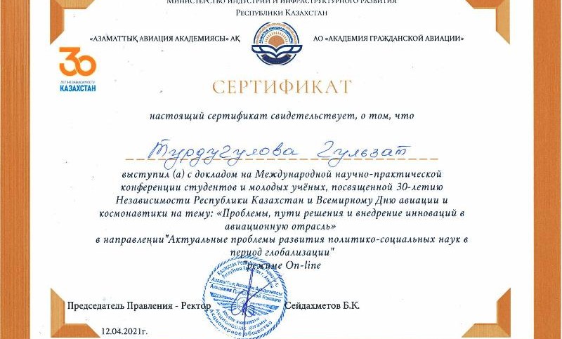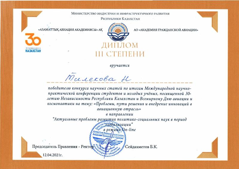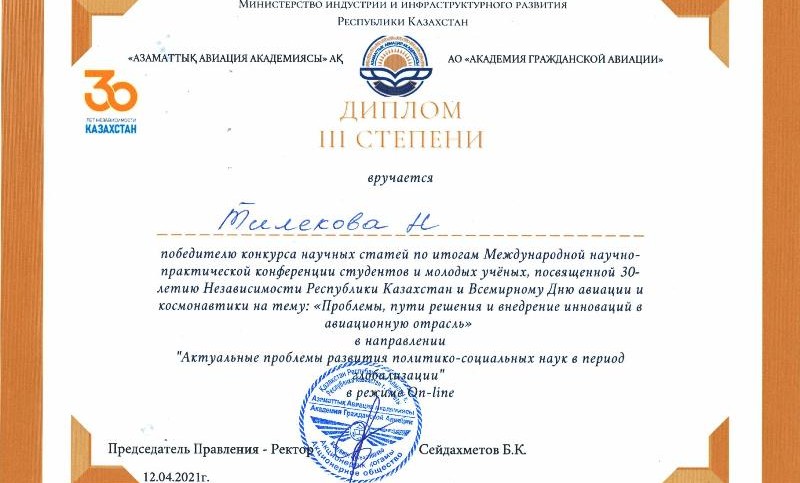 За доклад на Международной научно-практической конференции студентов и молодых ученых, посвященной 30-летию Независимости Республики Казахстан и Всемирному Дню авиации и космонавтики, на тему: «Проблемы, пути решения и внедрение инноваций в авиационную отрасль» студентам Кыргызского авиационного института имени Ишембая Абдраимова Нурайым Тилековой присужден Диплом III степени, Айдане Бүркүтбаевой и Бакыту Бакасову - Диплом II степени, старшему преподавателю Алтынбеку Куланбековичу Билгибаеву - Диплом I степени.