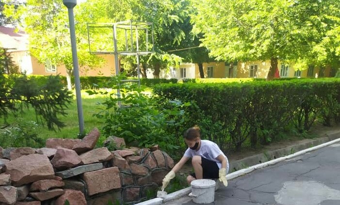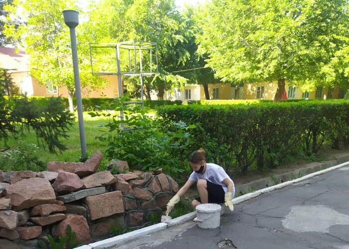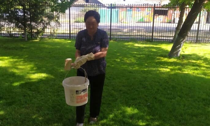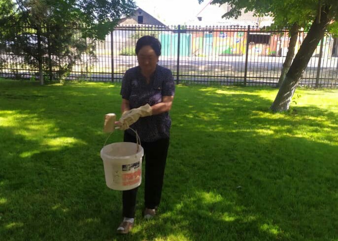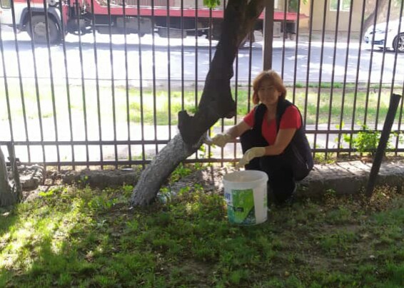 На субботнике 29 мая сотрудники побелили деревья и бордюры