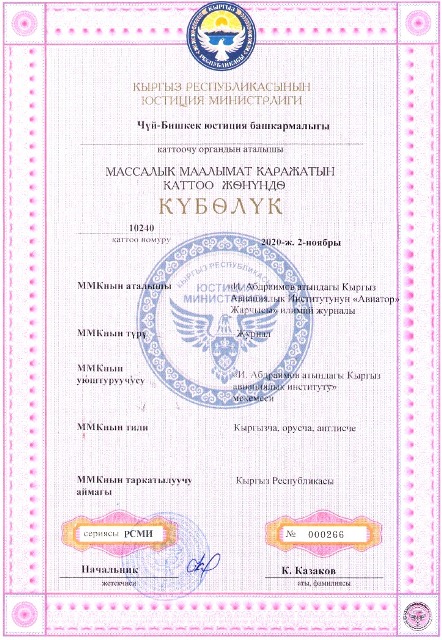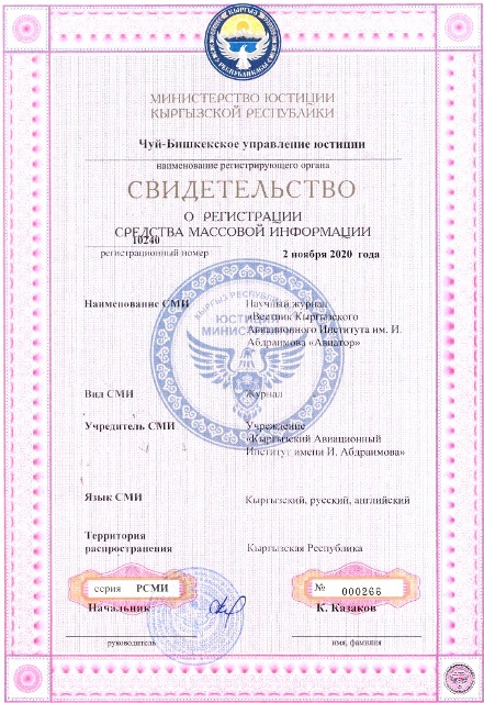 2 ноября 2020 г. Кыргызский авиационный институт им. И. Абдраимова получил свидетельство о регистрации научного журнала «Вестник Кыргызского Авиационного Института им. И. Абдраимова «Авиатор».