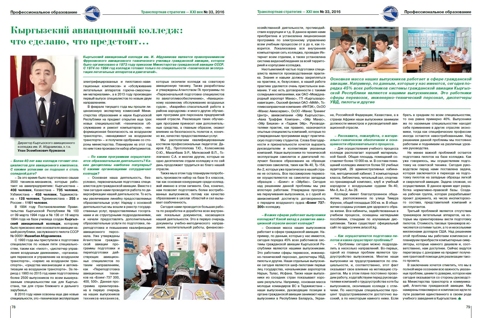 – Основная масса наших выпускников работает в сфере гражданской авиации. Например, по данным, которые у нас имеются, сегодня порядка 45% всех работников системы гражданской авиации Кыргызской Республики являются нашими выпускниками. Это работники сферы перевозок, инженерно-технический персонал, диспетчеры УВД, пилоты и другие. Наши отдельные выпускники сегодня являются шеф-пилотами первых лиц государства, начальниками аэропортов Нарын, Талас, Исфана. Также наши выпускники из соседних стран показывают хорошие результаты. Например, основная масса молодых командиров ВС в Таджикистане –наши выпускники, руководящие позиции в органе гражданской авиации занимают наши выпускники в Республике Беларусь, Украине, Российской Федерации, Казахстане, а в странах Африки наши выпускники занимали должности министров и руководителей авиационной отрасли.
