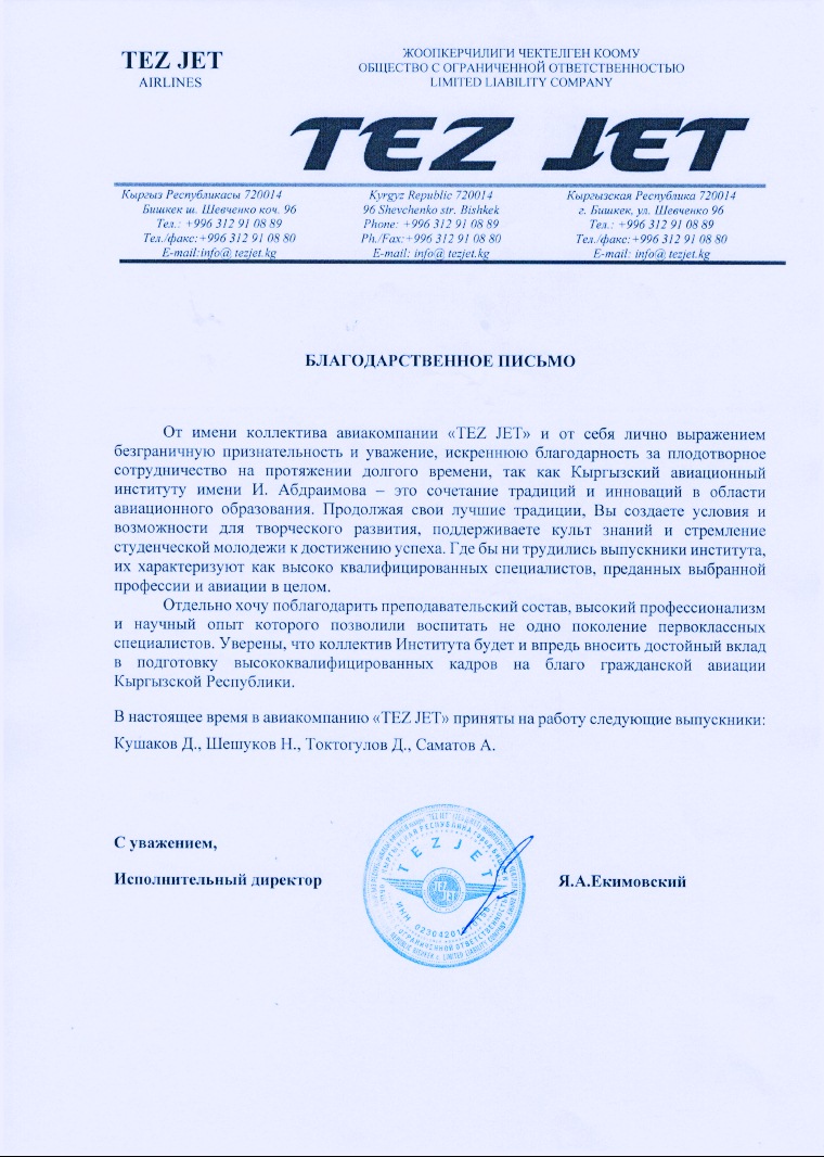 Авиакомпании «Авиа Траффик Компани» и «TEZ JET» направили благодарственные письма с добрыми пожеланиями в адрес Кыргызского авиационного института им. И. Абдраимова.