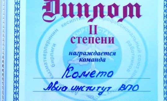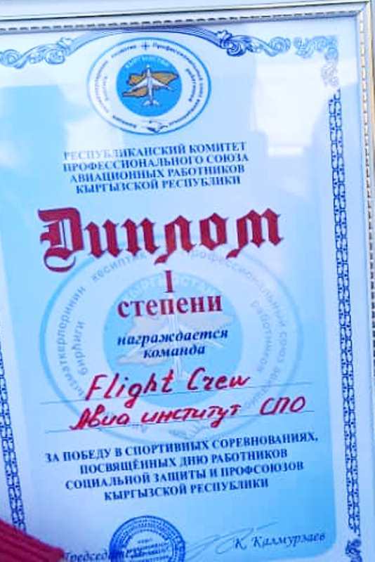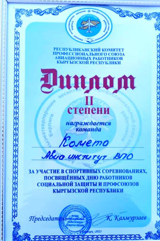 Команда "Flight Crew" отделения среднего профессионального образования получила диплом I степени и переходящий кубок молодёжного турнира, а команда "Комета" ВПО получила диплом II степени от Республиканского комитета профессионального союза авиационных работников Кыргызской Республики.