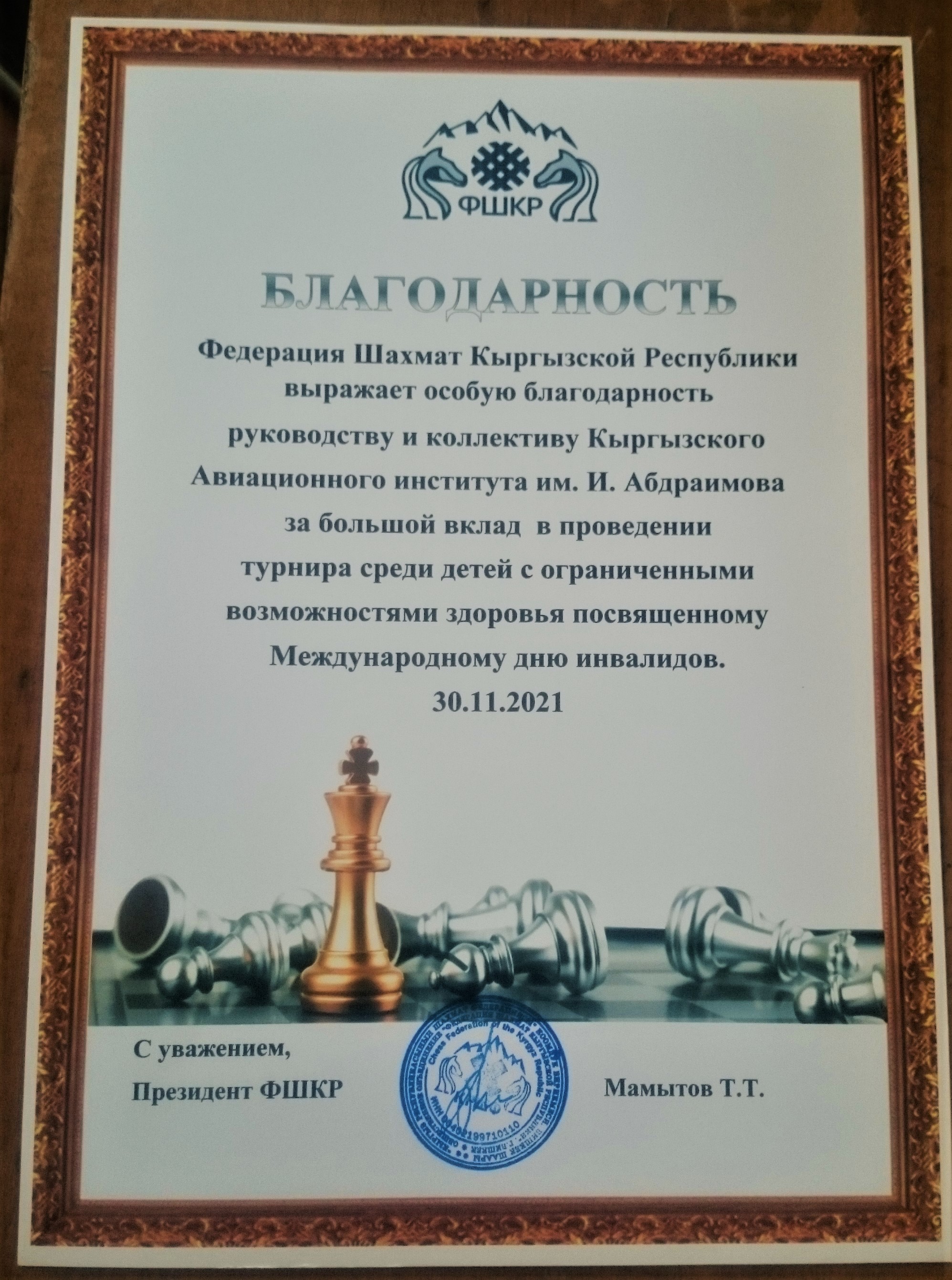 Институт получил Благодарственное письмо Федерации шахмат Кыргызской Республики