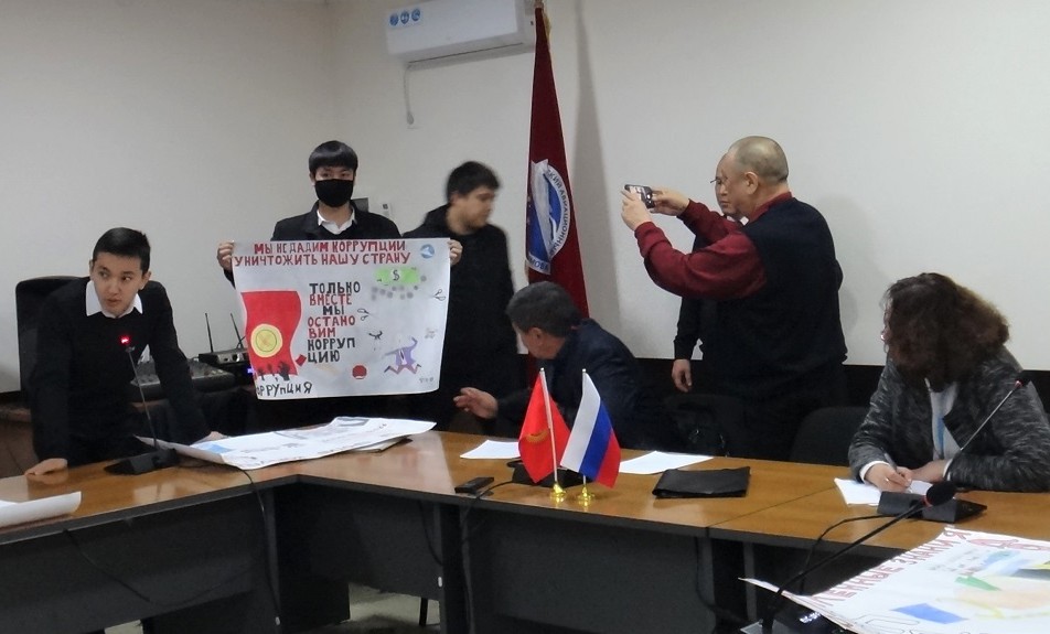 Комиссия, в состав которой вошли уполномоченный по вопросам предупреждения коррупции Министерства транспорта и коммуникаций Кыргызской Республики Ибрагимов А. М., представитель общественного объединения “Антикоррупционное общественное содействие” Ункуев К. А., заместитель директора КАИ по учебной работе Садовская О. А., заместитель директора КАИ по Государственному языку и воспитательной работе Эмчиева А. М., заместитель председателя комиссии КАИ по противодействию коррупции Манапбаев Э. Р., заведующая отделом качества, безопасности полётов и стандартов ИКАО Эрмексариева Г. М., рассмотрела работы, отражающие спектр взглядов молодежи и понимание методов борьбы с коррупцией.