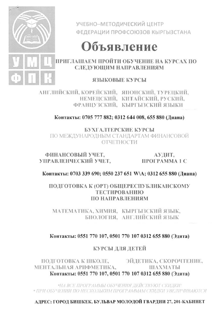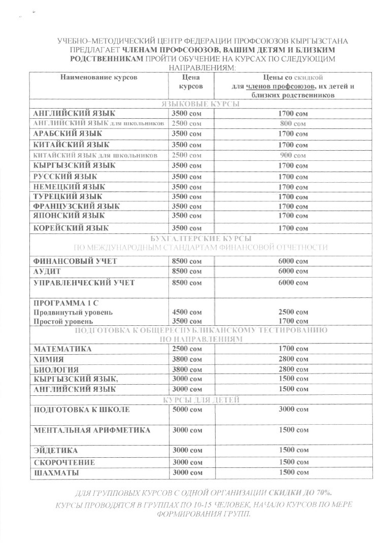 Учебно-методический центр Федерации профсоюзов Кыргызстана предлагает членам профсоюза, их детям и близким родственникам пройти обучение на курсах по направлениям: