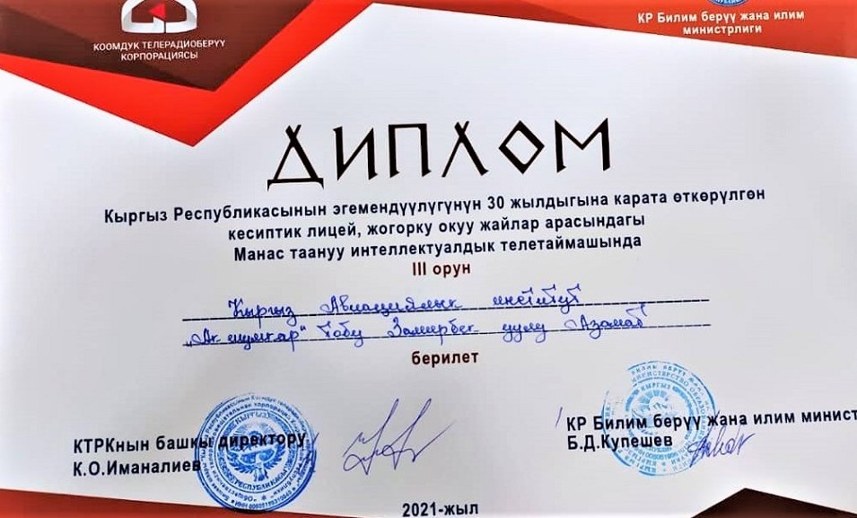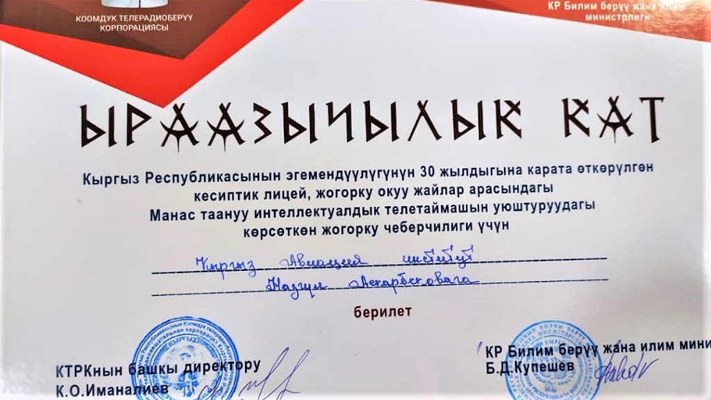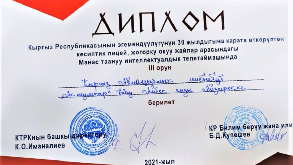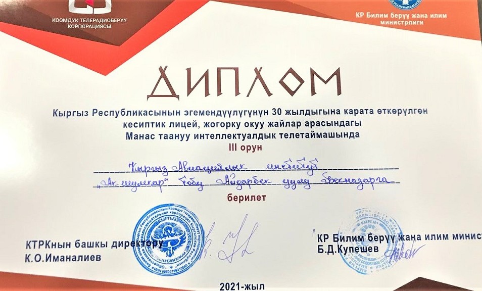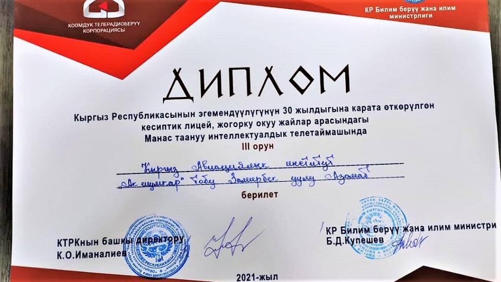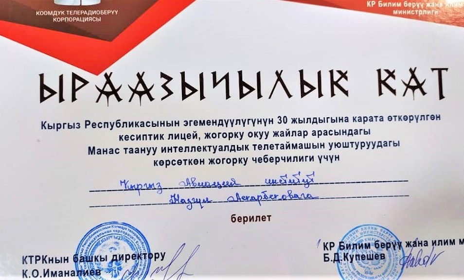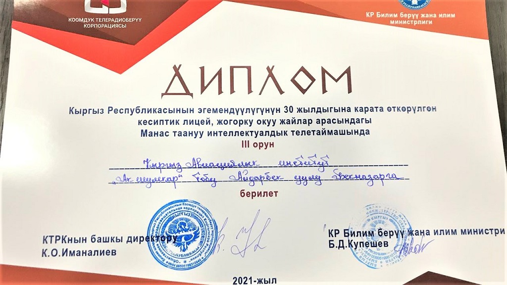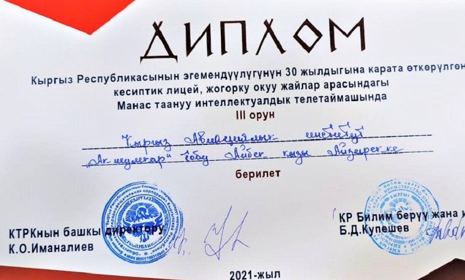 Члены команды Айбек кызы Айзирек, Айдарбек уулу Бекназар, Замирбек уулу Азамат получили Дипломы и призы, преподаватель Назгуль Аскарова получила Благодарственное письмо.