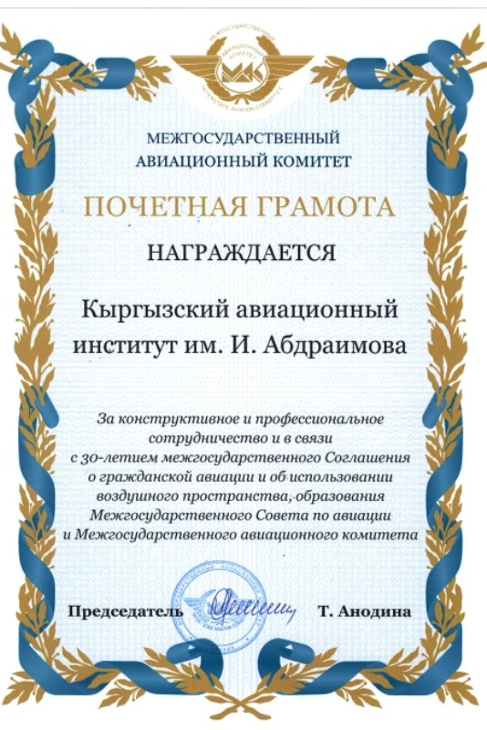 Кыргызский авиационный институт им. И. Абдраимова за конструктивное и профессиональное сотрудничество награждён Почётной грамотой Межгосударственного авиационного комитета.