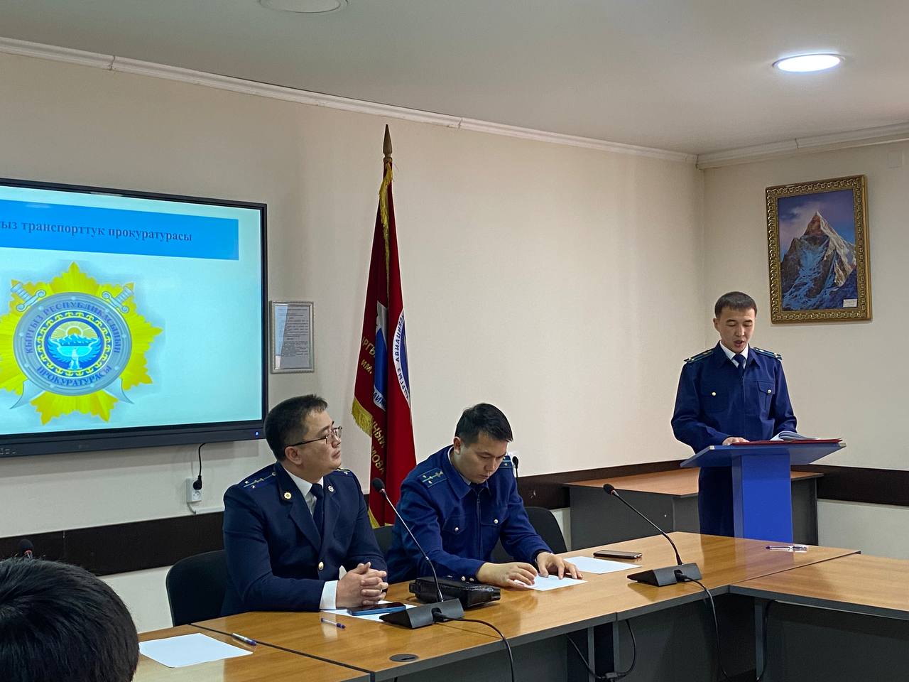 Анда, Кыргыз транспорттук прокурорунун орун басары Б.Мырзахматов, Кыргыз транспорттук прокурорунун улук жардамчысы И.Садыков жана Кыргыз транспорттук прокурорунун жардамчысы Н.Усеновдор жашы жете элек студенттерге прокуратура органдарынын системасы, укуктук негиздери тууралуу айтып, «Жашы жете элек балдар арасындагы кылмыштуулукту болтурбоо жана алдын алуу маселелери" темасында видео роликтер жана презентациялар көрсөтүлүп, студенттерди кызыктырган суроолоруна жооп беришти.