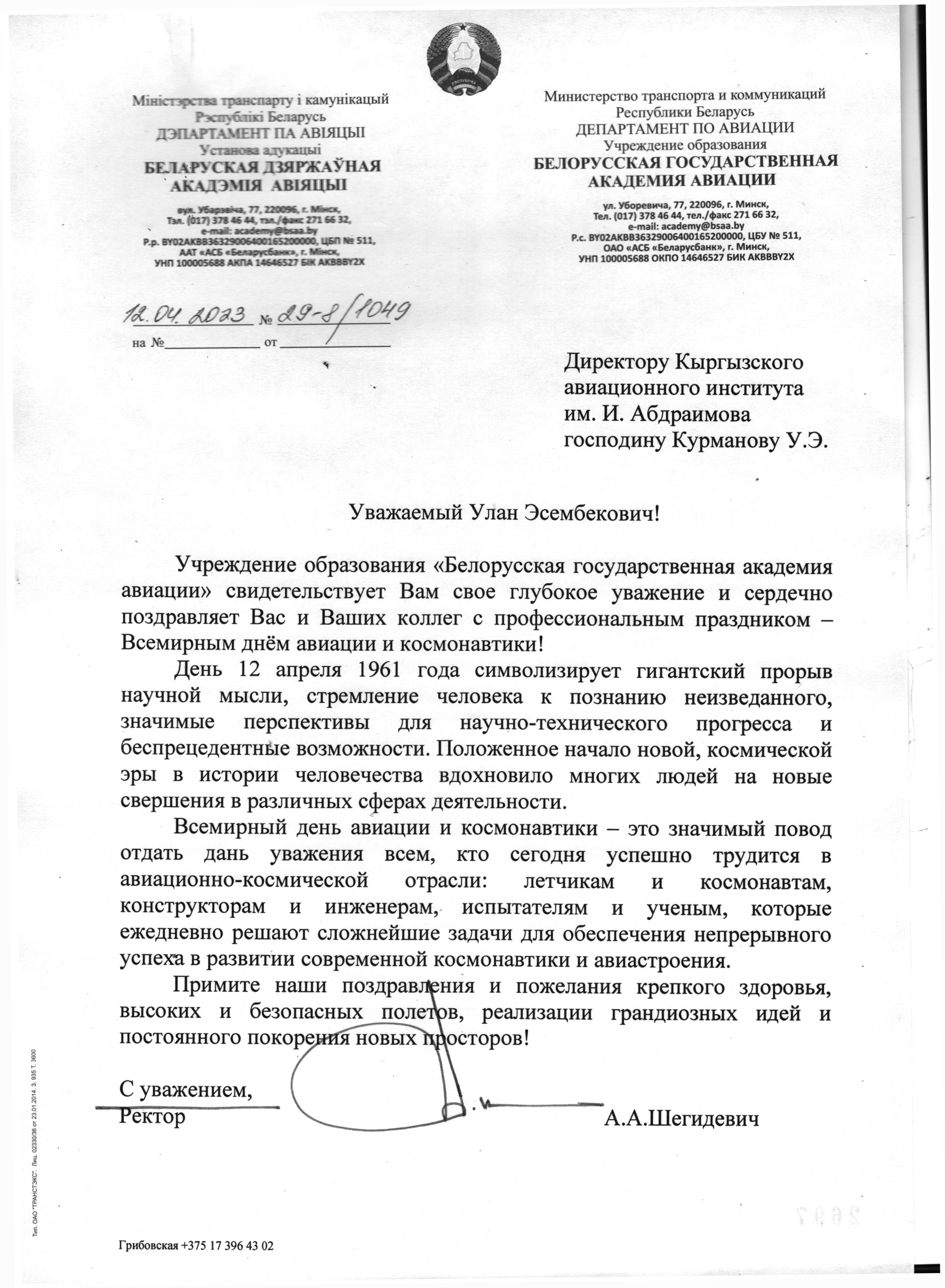 Руководство Белорусской Государственной Академии Авиации поздравил коллектив института с профессиональным праздником - Всемирным днем авиации и космонавтики