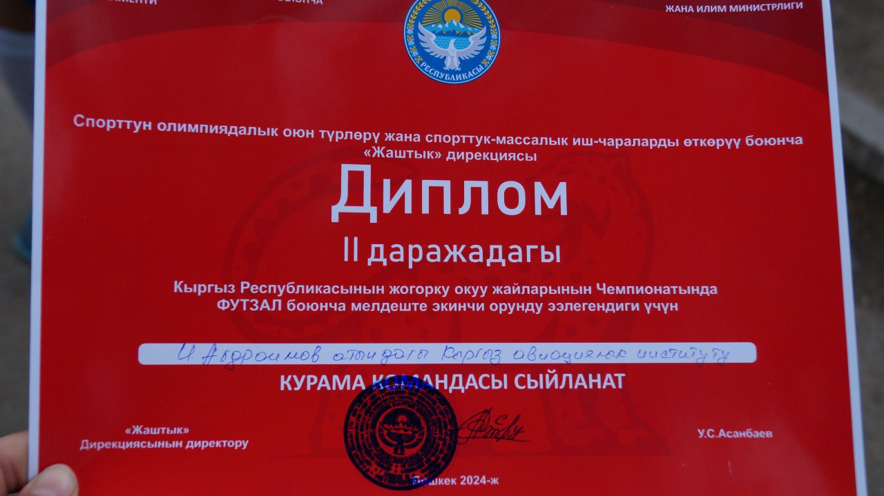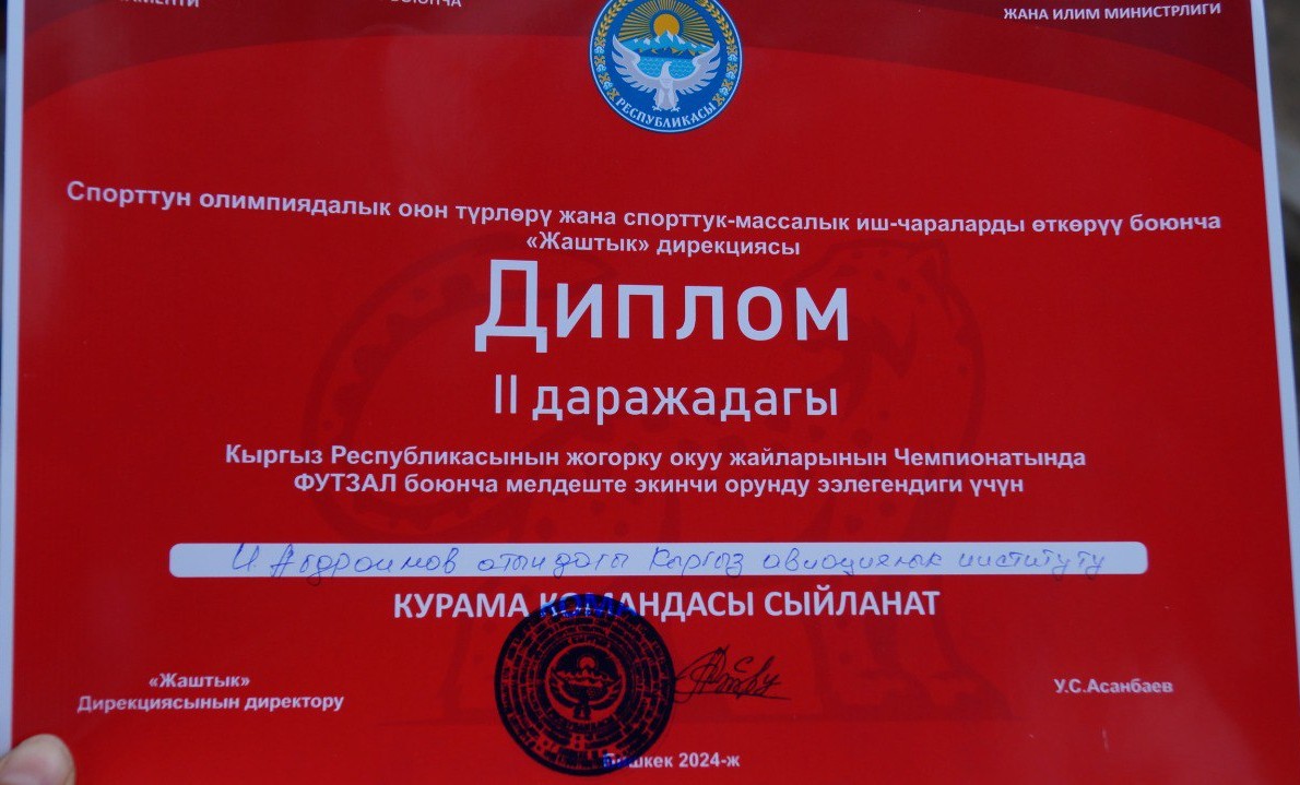 Сборная Кыргызского авиационного института заняла второе призовое место по футзалу в Чемпионате среди Высших учебный заведений Кыргызской Республики. Нашей сборной удалось выйти из группы и пройти финал, где они уступили 1 место КТМУ «Манас». Чемпионат проходил в Бишкеке и в нем участвовали сборные команды ВУЗов со всех регионов. Поздравляем наших студентов с победой и искренне гордимся!